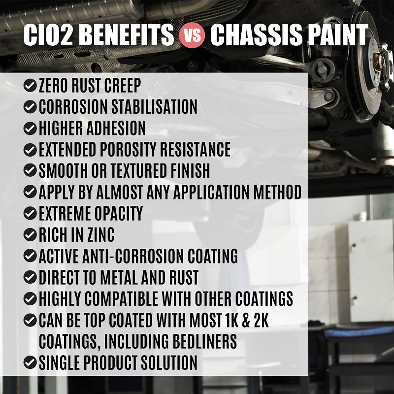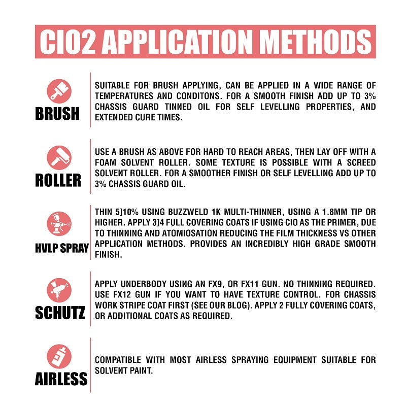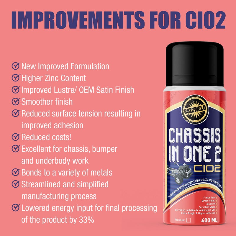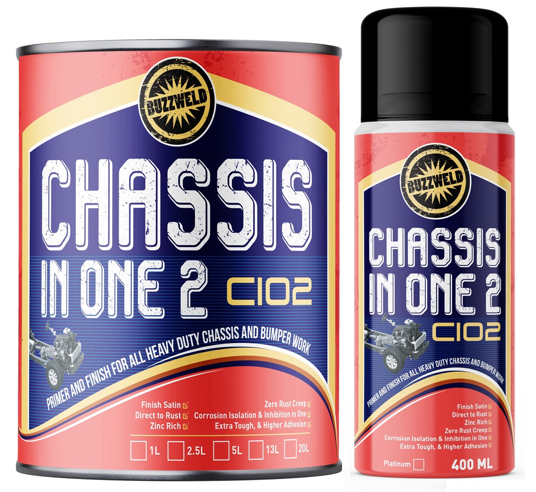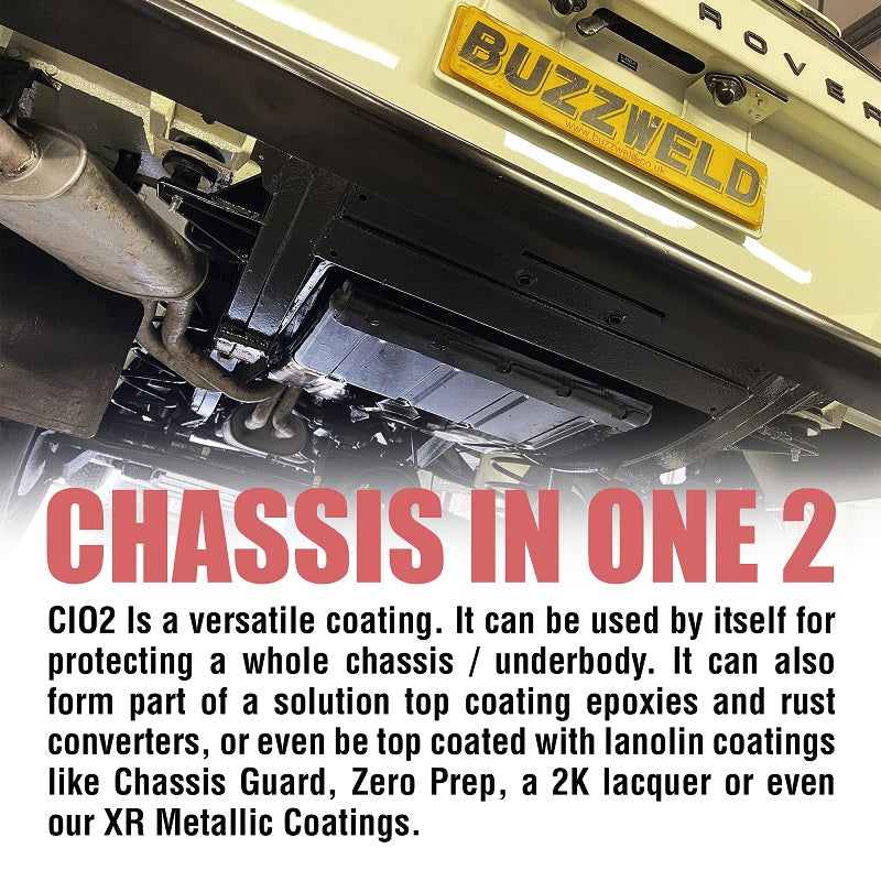 Buzzweld CIO (Chassis In One) is a high-adhesion corrosion stabilising primer and top coat in one, designed for customers seeking a simple, long-term solution for chassis and underbody protection. The CIO system requires just two coats to protect your chassis when brush or Schutz applied, making it significantly faster and more cost-effective than traditional multi-stage systems.